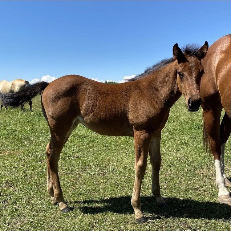 This bay filly can be summed up in one word, 'adorable'. She is an extremely well-made bay filly who is smooth moving, well balanced, and muscular. This filly will be stocky and she was designed to be an everyday horse. We just sold her sister who was an absolute sweetheart and pleasure to ride. Excellent ranch prospect for sorting, doctoring, gathering, and dragging cattle to the fire. She has the potential to go any direction from cutting, working cow horse, western, 4H, poles, team penning, or pleasure trail riding. She is a sweet filly that you are bound to fall in love with. She has no markings on her legs but does have a tapering stripe on her face. Don't miss out on this darling filly!